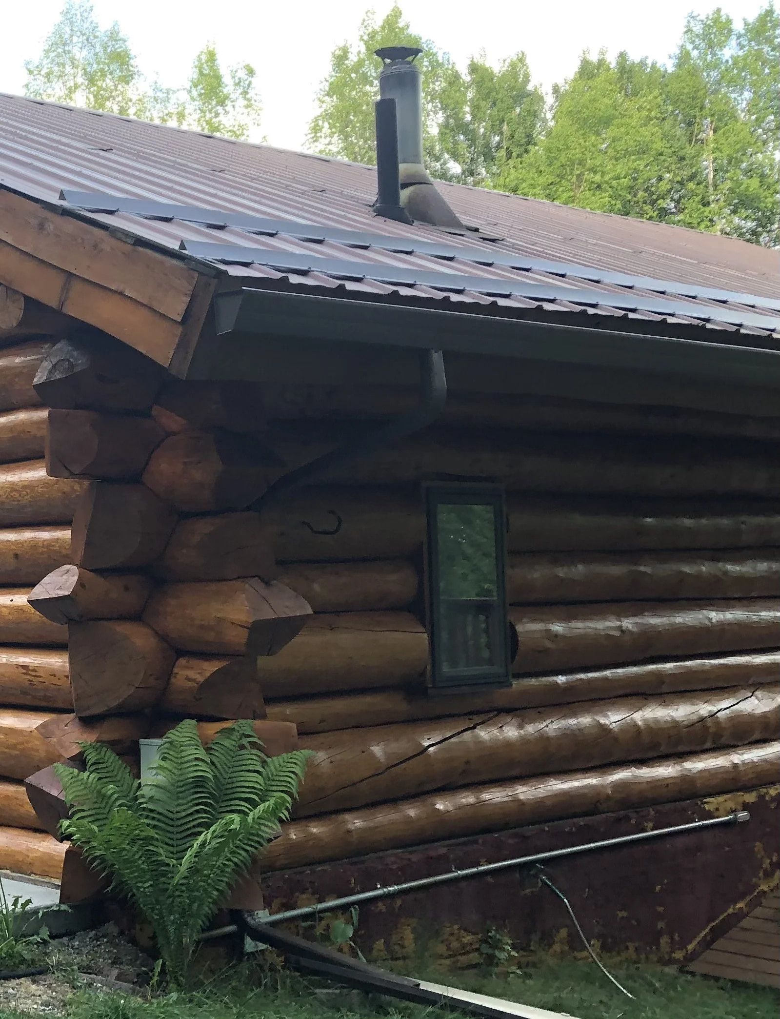 Ideally, a log home is designed and built in a way that the logs are up off the ground and have sufficient roof overhangs protecting against rain and weather. Remember to install gutters and direct that rain water away from your logs and foundation.